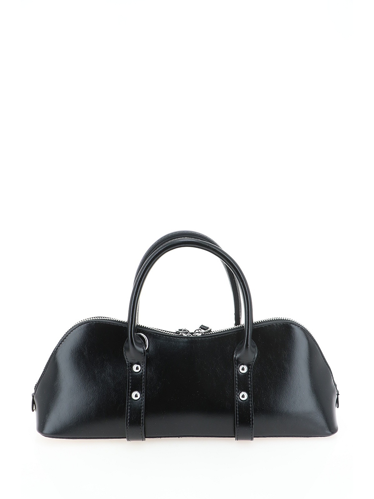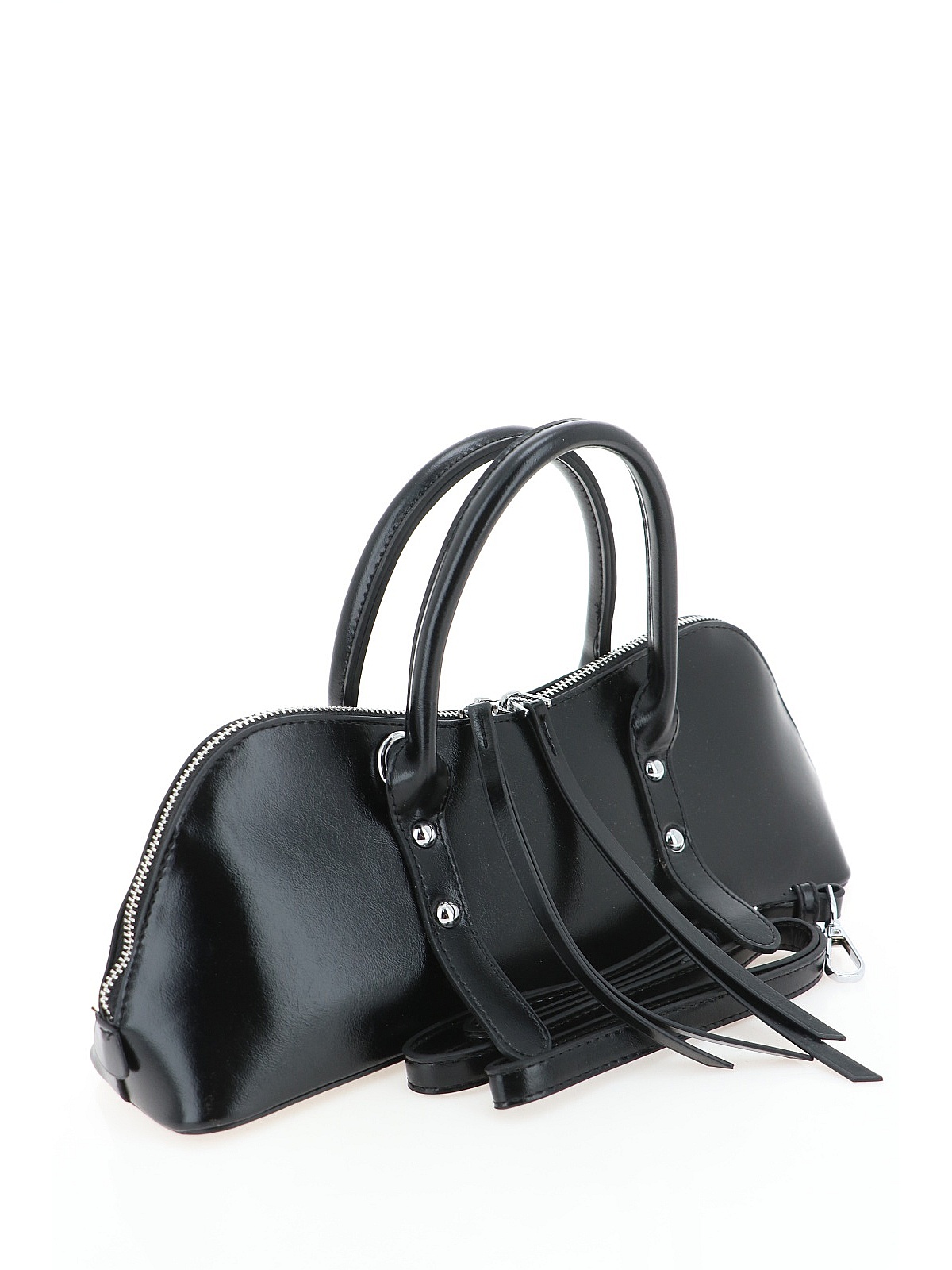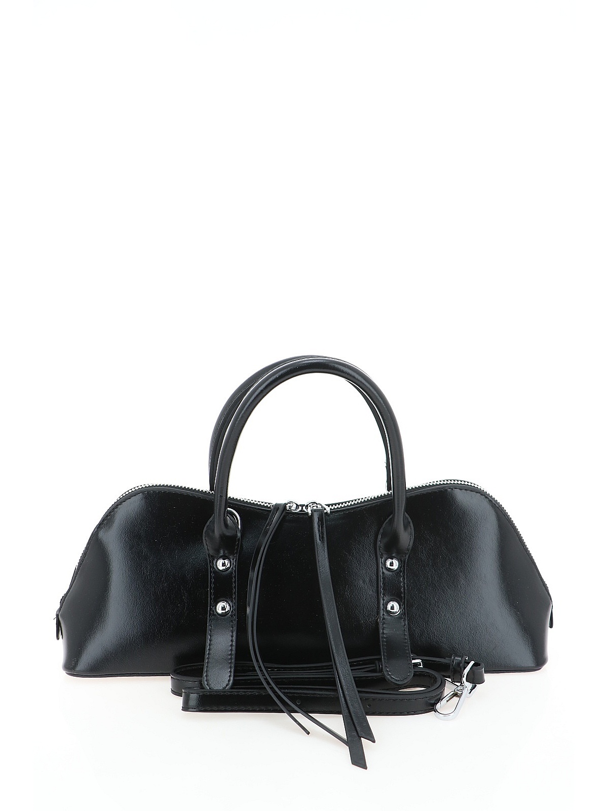 Женская сумка PORTOFIANO – это стильный аксессуар в черном цвете, выполненный из гладкой искусственной кожи с мягким полуматовым блеском. Модель имеет вытянутую форму со скругленными углами – компактный и аккуратный силуэт, который привлекает внимание. Главные детали, создающие характер сумки: круглые металлические заклепки серебристого цвета на передней панели и в местах крепления ручек, а также длинные декоративные ремешки, свисающие с бегунков молний. Такое сочетание добавляет аксессуару легкую дерзость и выделяет его среди классических моделей.