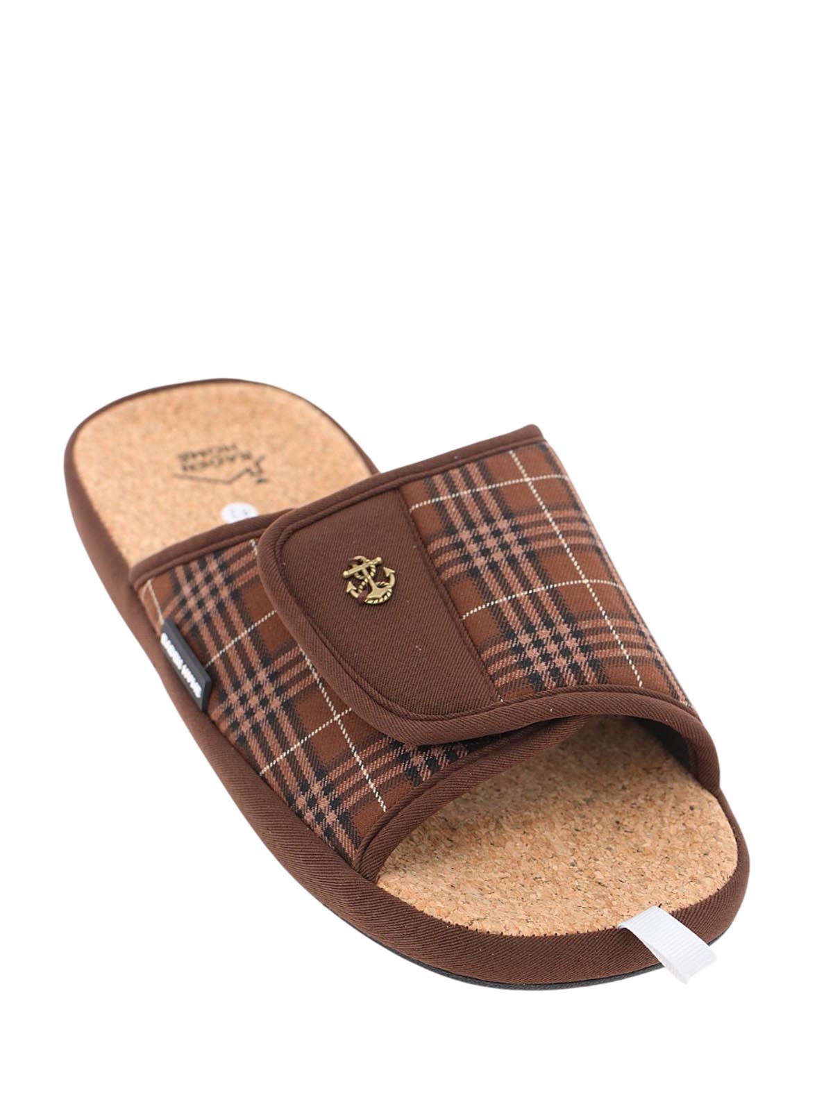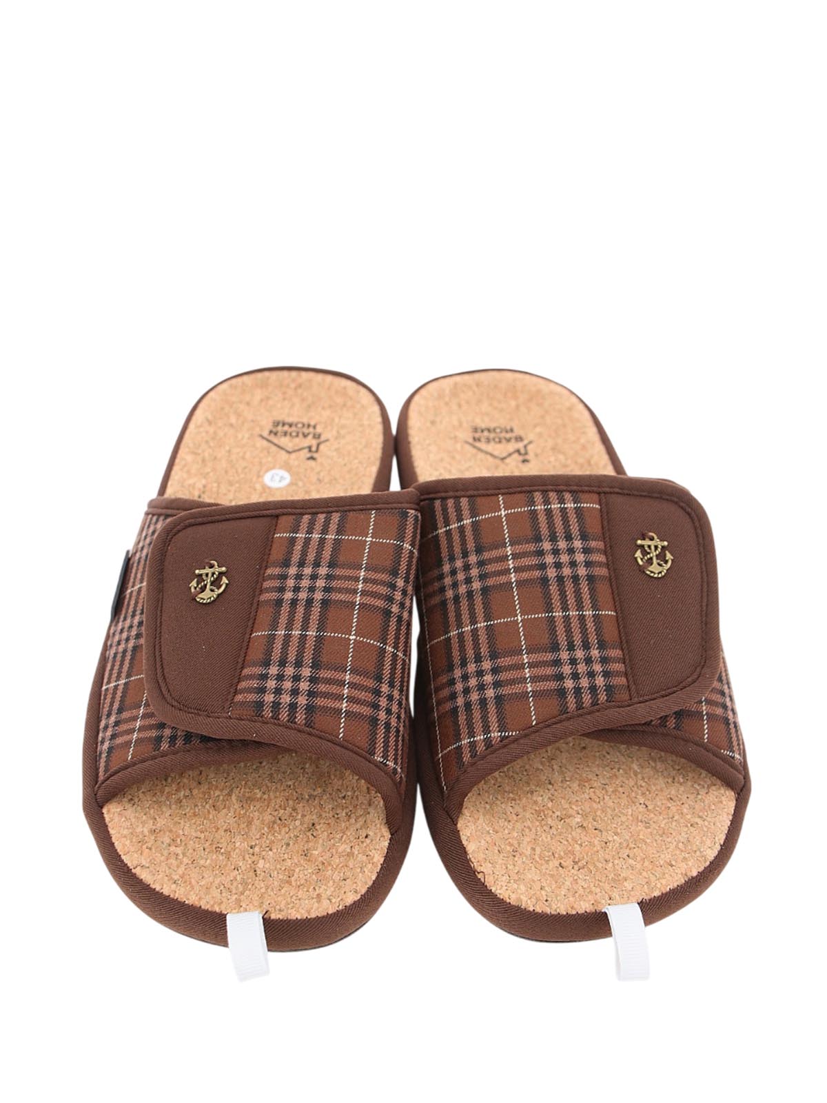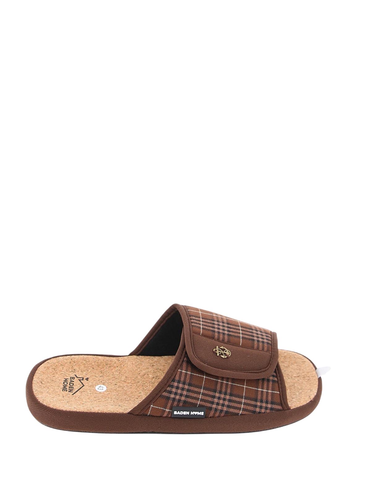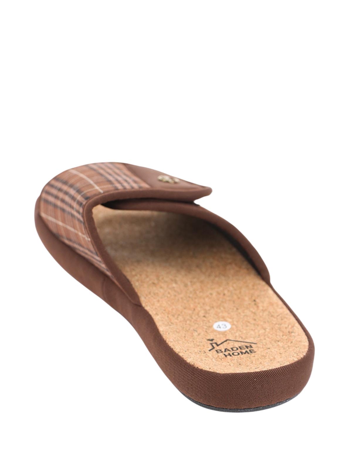 Мужские коричневые домашние тапочки BADEN в клетку на липучке с открытым носом и пяткой. Модель на плоской подошве ориентирована на комфорт и удобство для отдыха дома.
