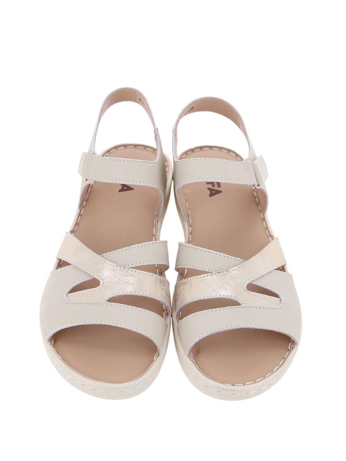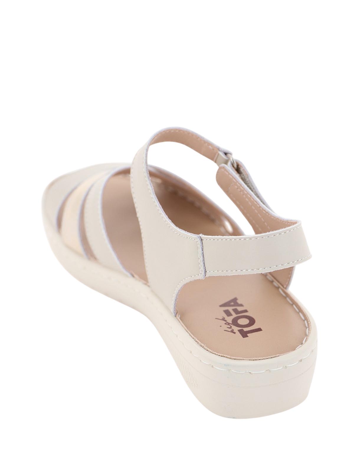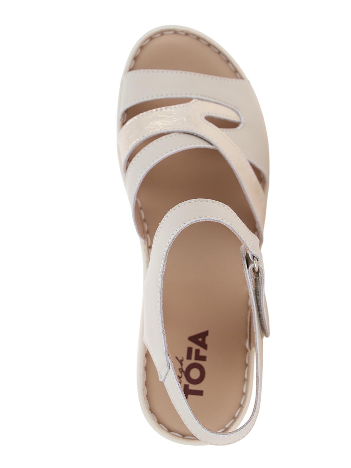 Женские бежевые босоножки TOFA с перламутровым отливом в повседневном стиле. Модель на танкетке с открытым носом и пяткой, фигурными ремешками и застежкой-липучкой сочетает нежное сияние и комфорт для теплого сезона.