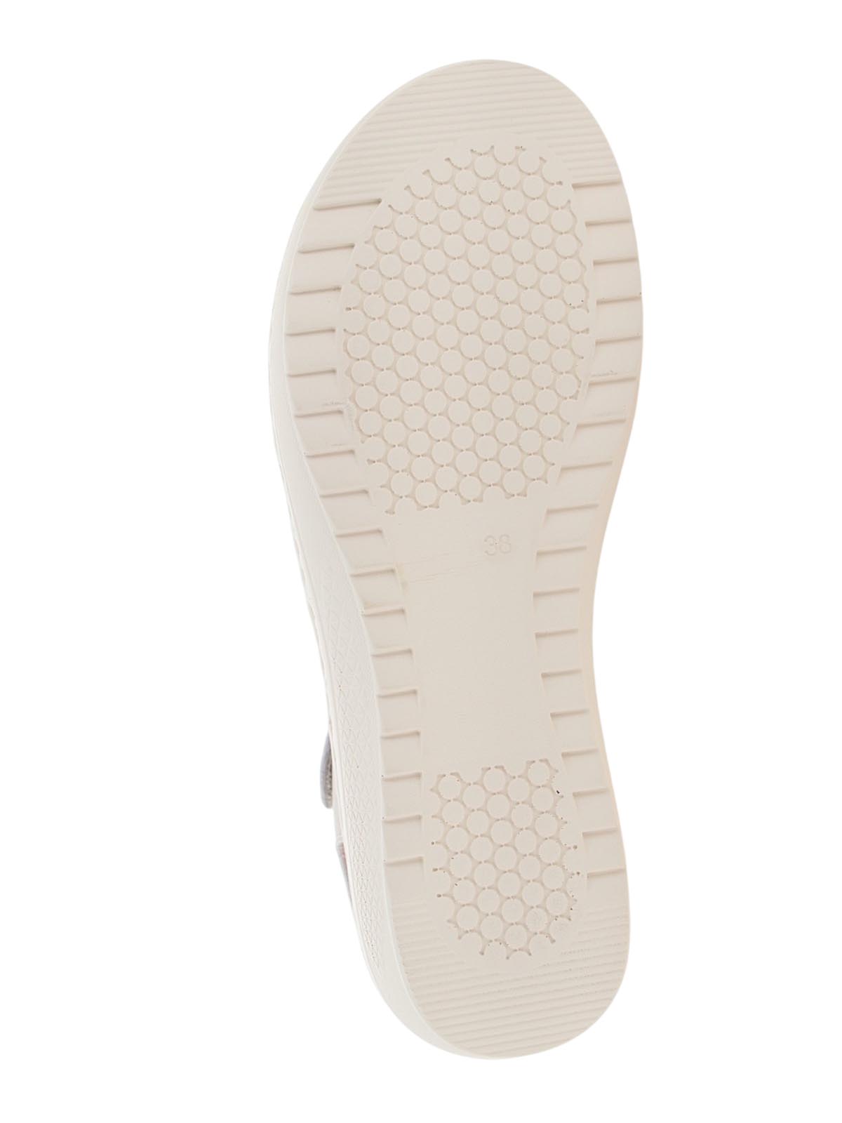 Верх из натуральной кожи с перламутровым эффектом придает обуви мягкий блеск и выразительность. Подкладка и стелька из микрофибры создают гигиеничный микроклимат и приятные тактильные ощущения. Фигурные ремешки формируют изящный дизайн, а застежка-липучка позволяет быстро регулировать полноту и надежно фиксировать стопу. Танкетка из полиуретана гарантирует устойчивость и легкость при ходьбе.